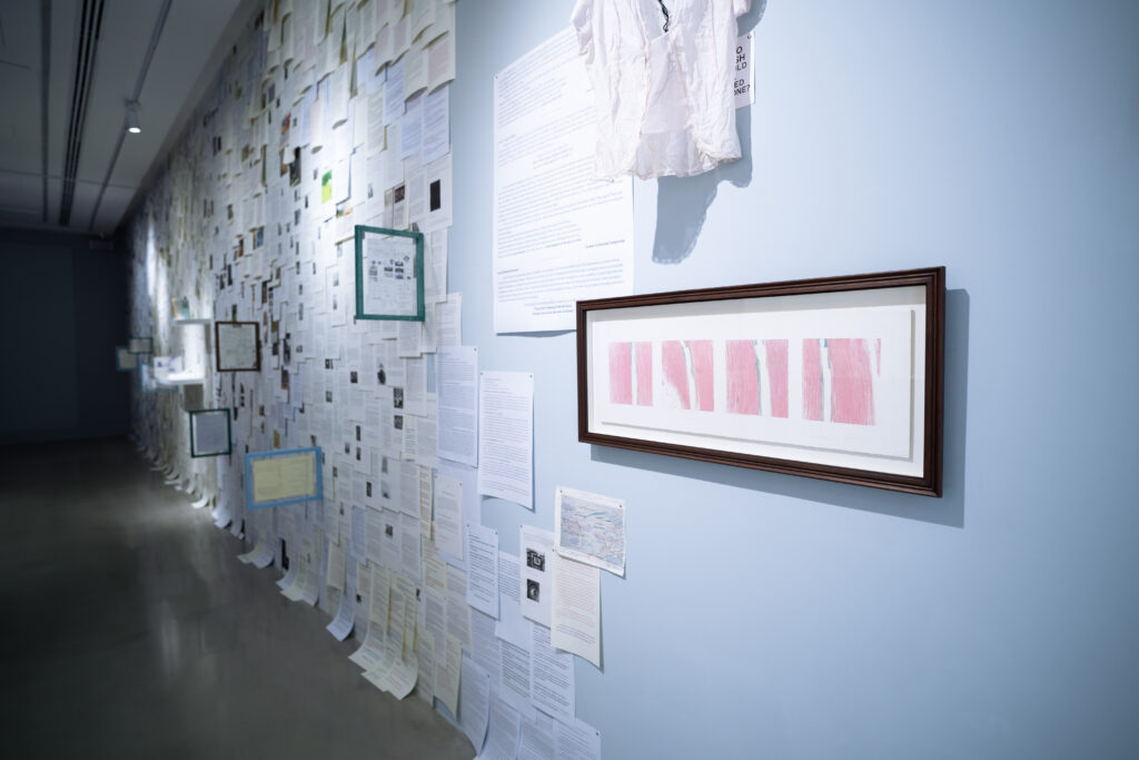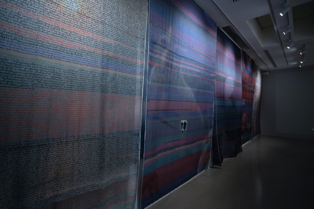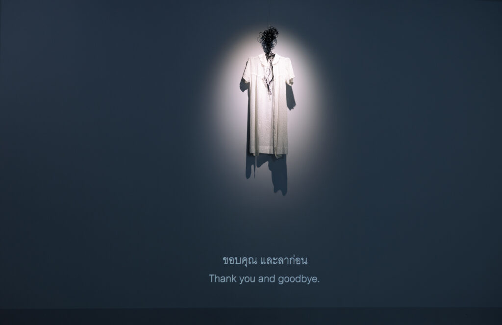 In 2017, 100 Tonson Gallery conceived, in collaboration with Araya Rasdjarmrearnsook, the exhibition “An Artist is Trying to Return to 'Being a Writer’”, foregrounding her liminal stance between the role of “writer” and that of “artist.” Revisiting this gesture, “Textually,” is not only a continuation of Old Karma, but also a sequel to the 2017 exhibition that embodied the gesture of “Trying to,” by unfolding writings long completed in the past, unfastening them, and stitching them into outlines and notes she inscribed in the midst of working. At the opposite side of the room, the gesture of “Return to 'Being a Writer’” is made explicit through “another unfinished writing outlined as a novel, stiff and unyielding, halted entirely upon encountering a scene too beautiful to proceed.” These two currents are woven together with video works that carry her words in the voice of “An Artist,” drawing attention to Araya’s orthographic process—her insistence upon words, upon phrases, upon narration and text—reflecting her perspectives on memory, on dogs, on life, on death, and on art from another angle.