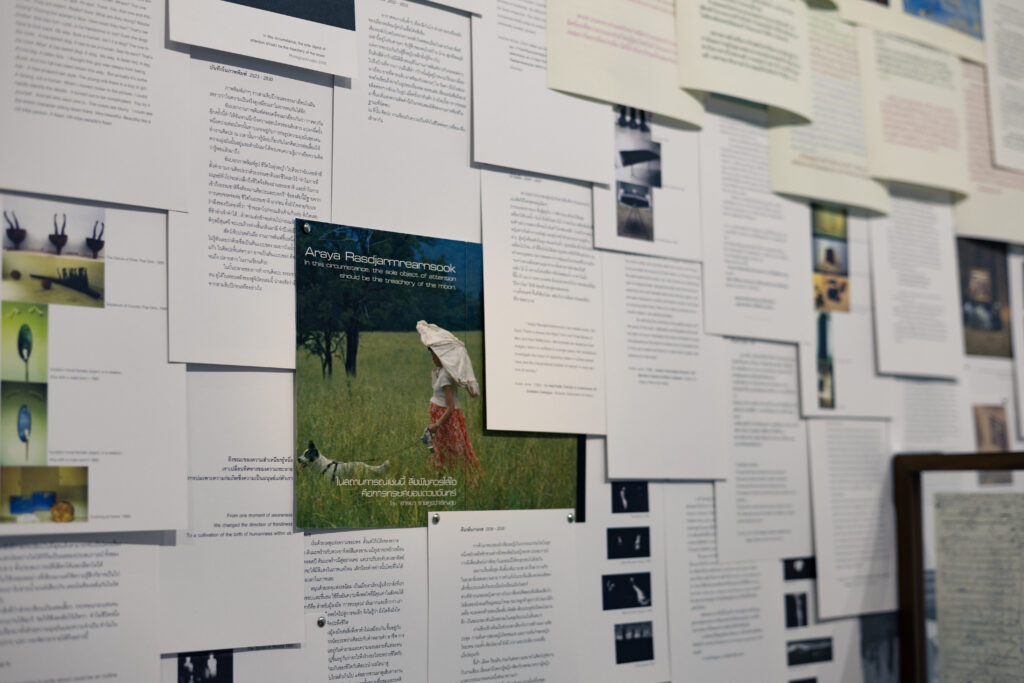 This exhibition also arose from conversations and guidance offered by Sayan Daengklom—lecturer, critic, scholar, and Araya’s “friend who was an Art historian.” Sharing a mutual interest in the trajectories of art, word, and literature, Sayan and Araya, together with 100 Tonson Foundation, invited over forty collaborators, scholars, curators, artists, and devoted readers of her prose to contribute passages of her words that continue to echo, prod, linger, or remain lodged in their memory. These fragments were rearranged into something akin to an unpolished long short story composed of her own words—an act of gathering and underscoring certain luminous facets of Araya’s selection of vocabulary and meaning.